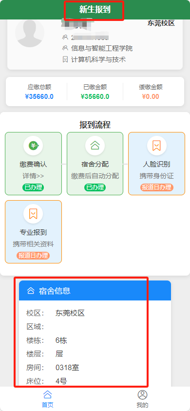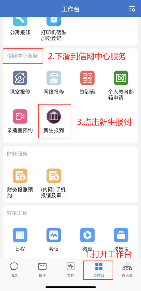 打开【企业微信】--打开工作台--下滑到信网中心服务--点击【新生报到】 →查询宿舍信息